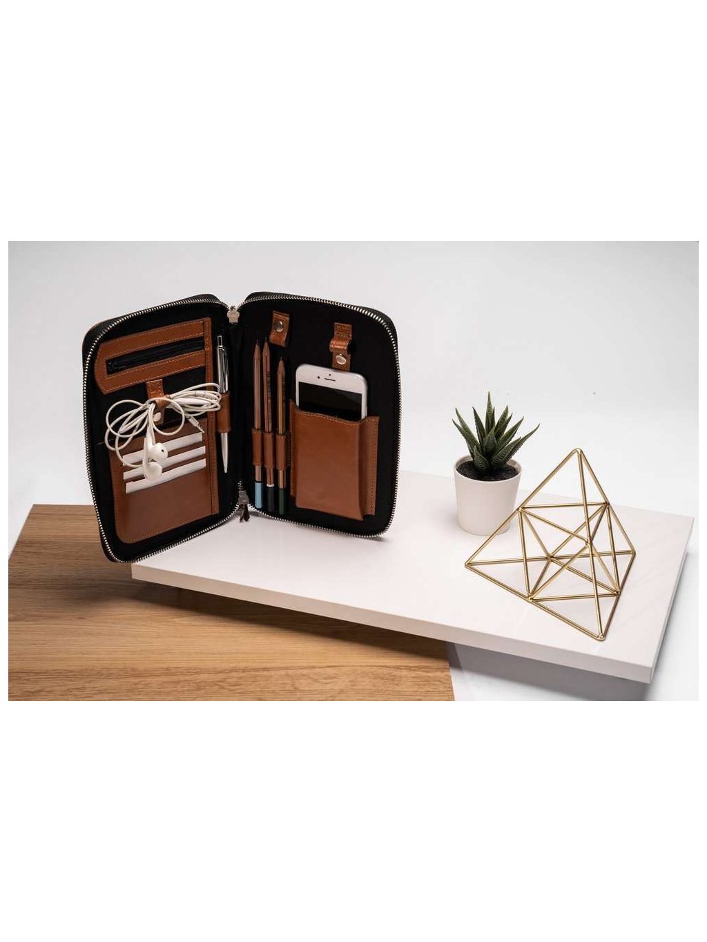 - vo vnútri sú priehradky na vizitky, na perá, vrecko na telefón, vrecko na zips, miesto pre slúchadlá