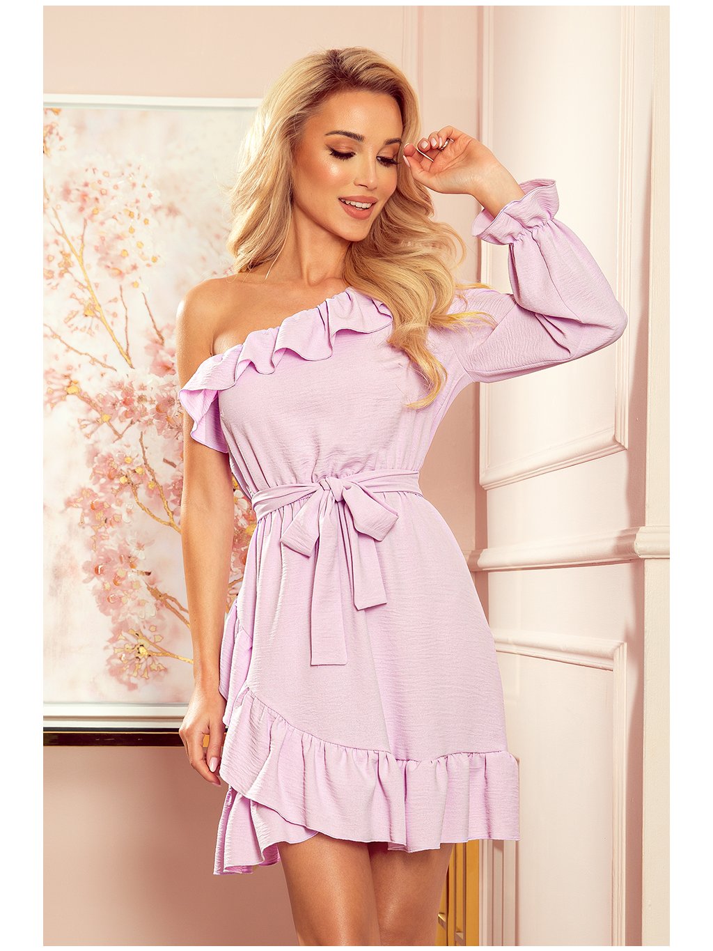 Svetlofialové šaty na jedno rameno s volánikmi ROSITA