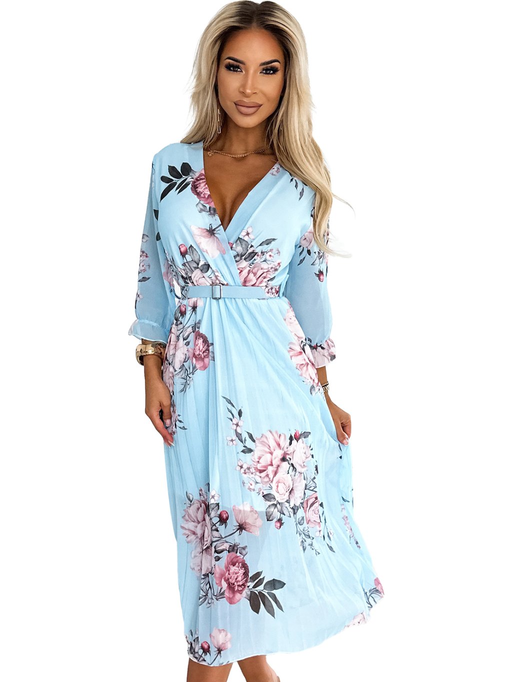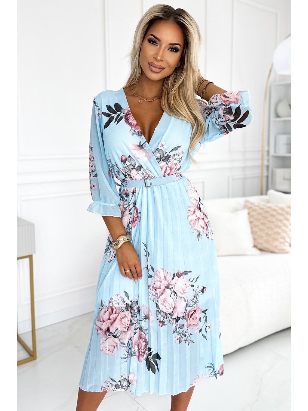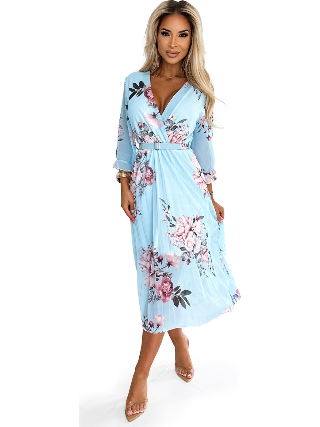 Plisované kvetované svetlo modré midi šaty s pásikom YUNA