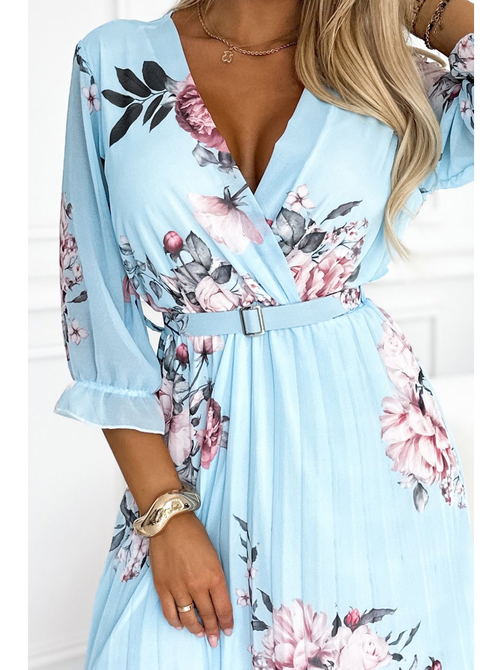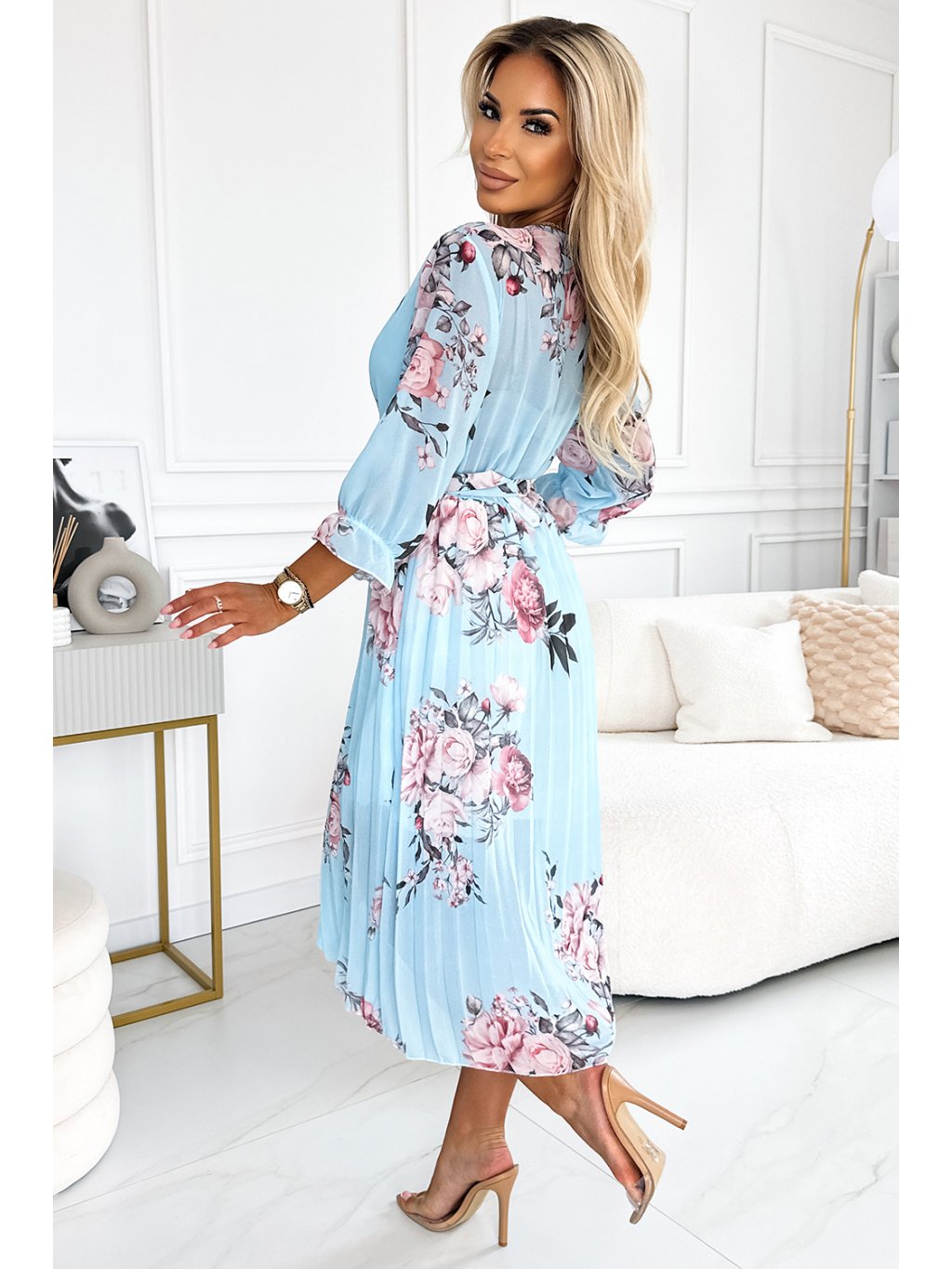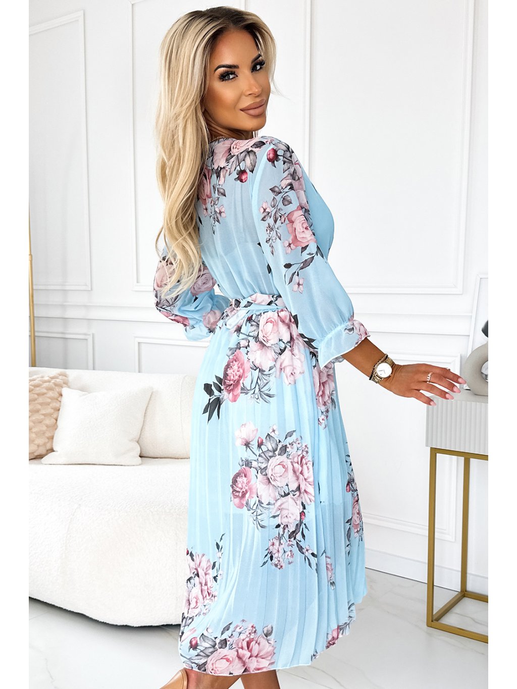 Plisované kvetované svetlo modré midi šaty s pásikom YUNA