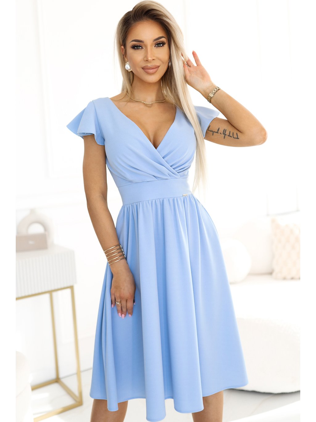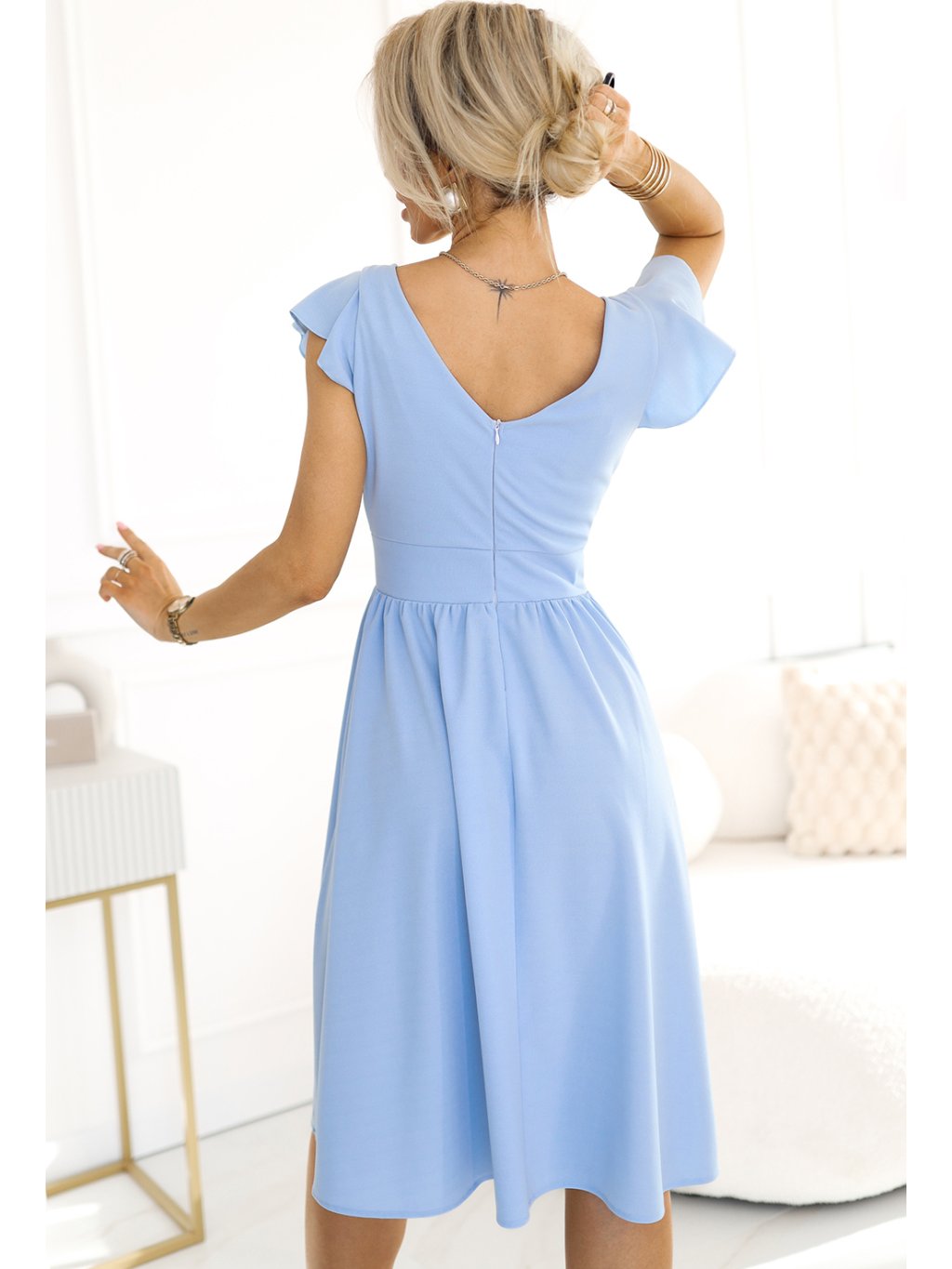 Svetlomodré šaty s výstrihom a krátkym rukávom MATYLDA
