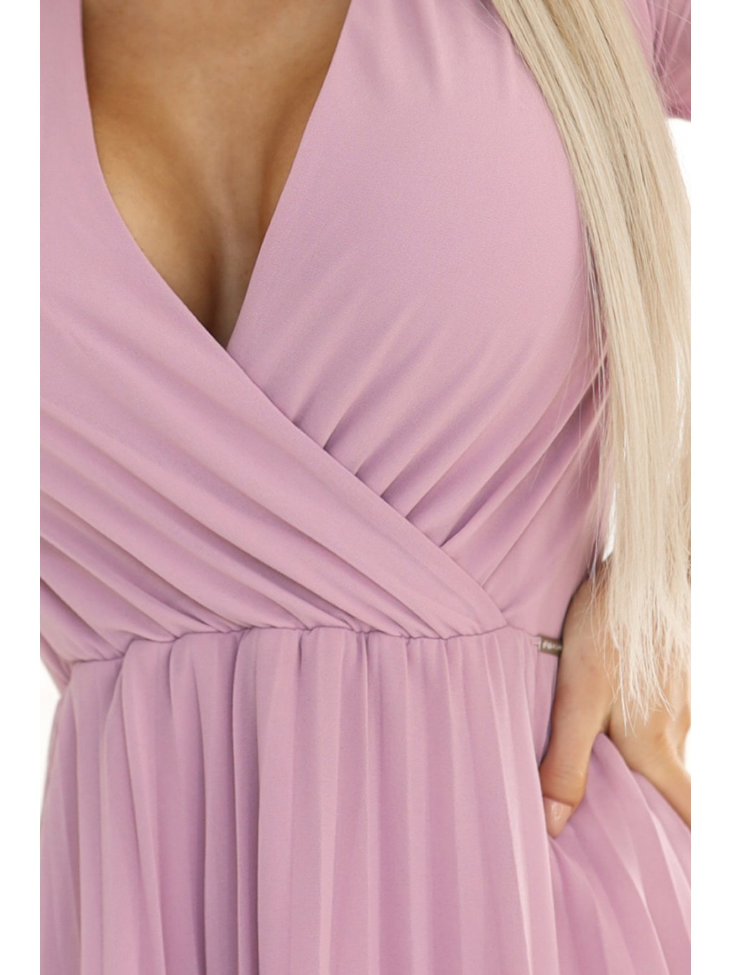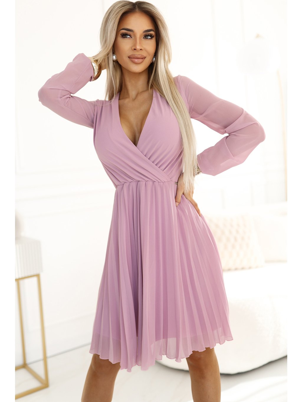Svetloružové dámske plisované šaty s dlhými rukávmi a výstrihom CAMILLA