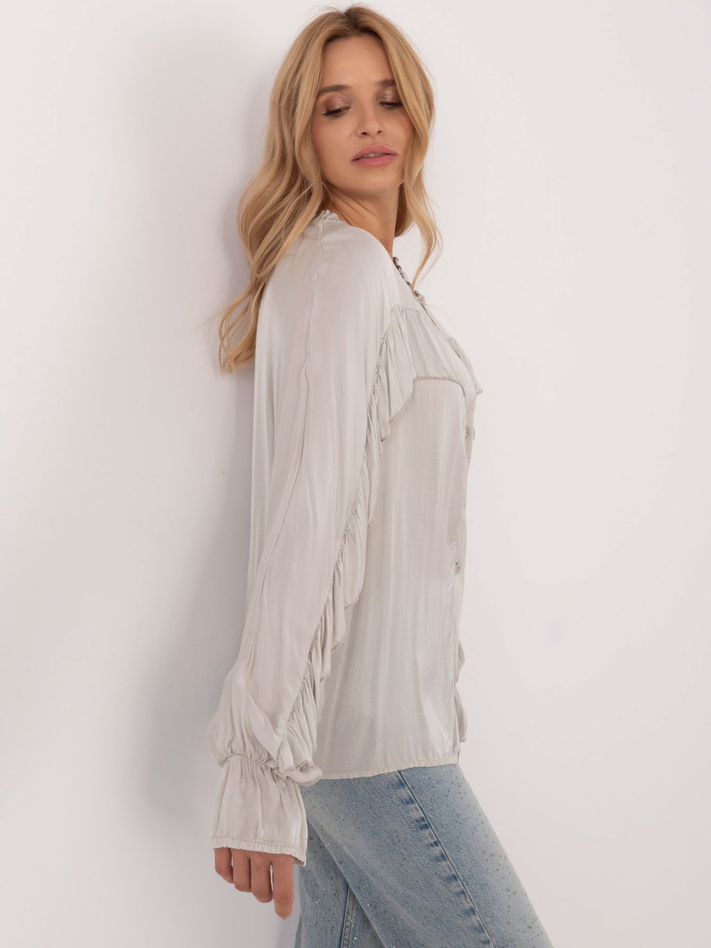 Svetlosivá dámska košeľa s volánom a viazaným výstrihom