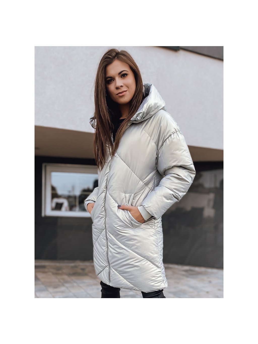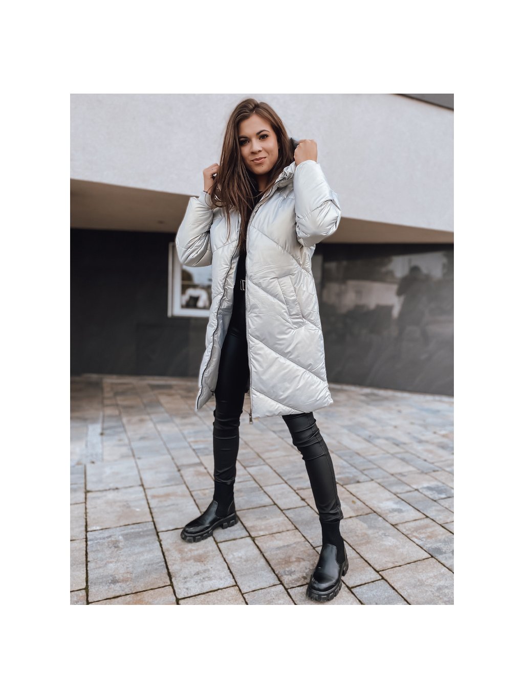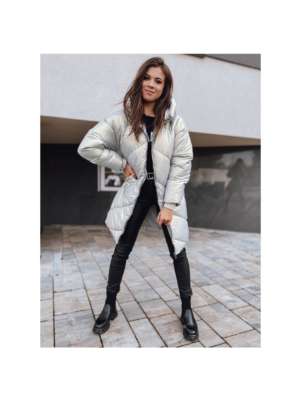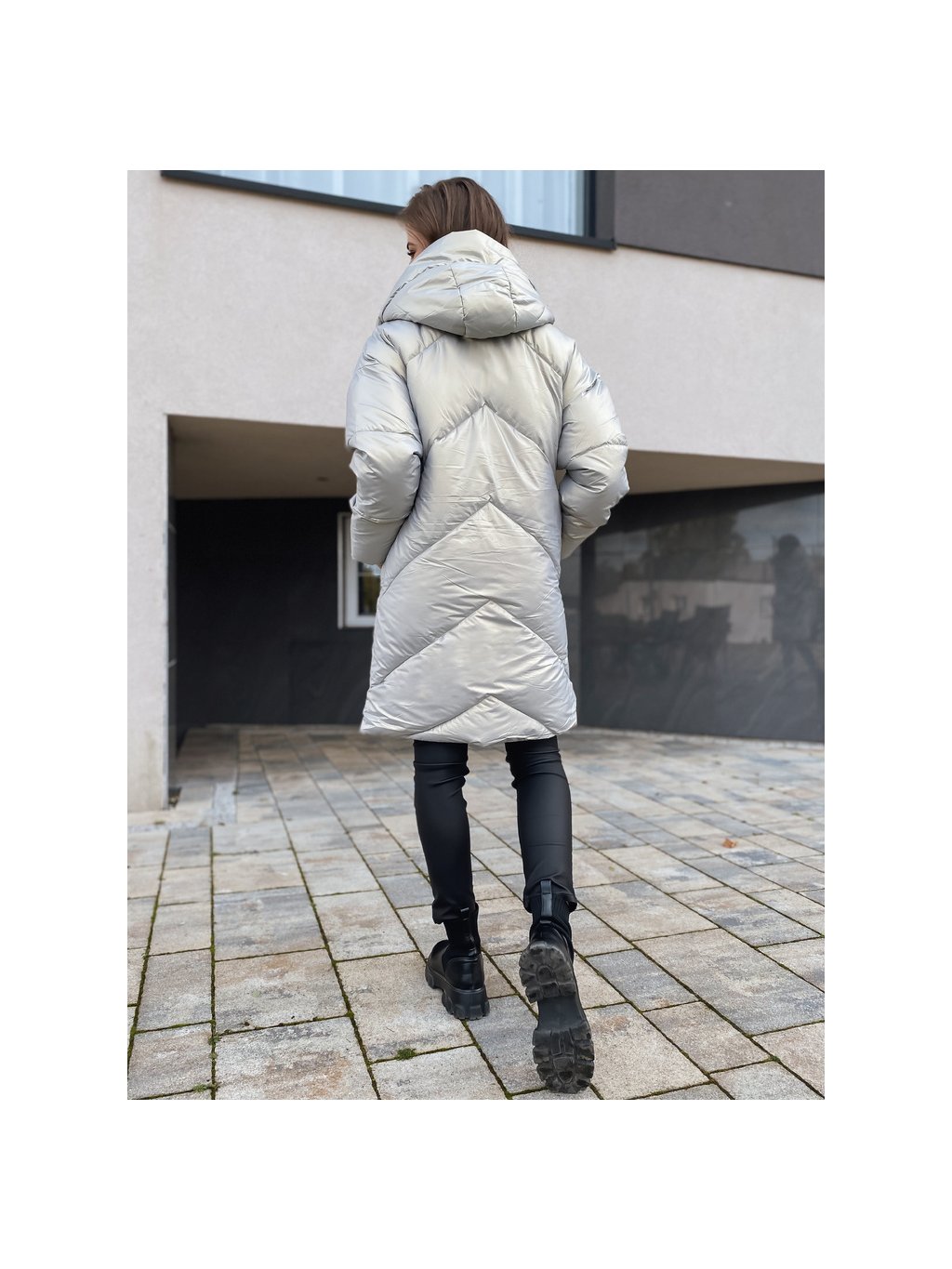 Svetlosivý dámsky lesklý zimný prešívaný kabát so zlatými odleskami