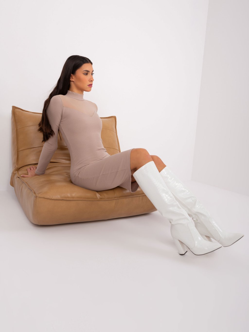 Tmavobéžové mini šaty s priesvitným výstrihom a chrbtom
