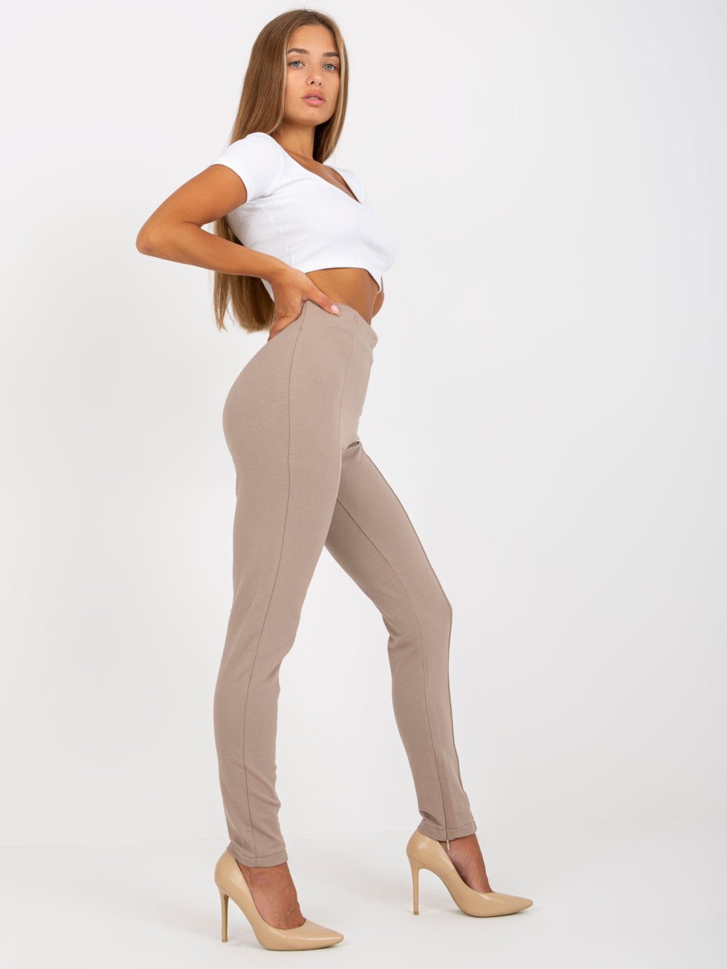 Tmavobéžové legíny so zipsami pri členkoch