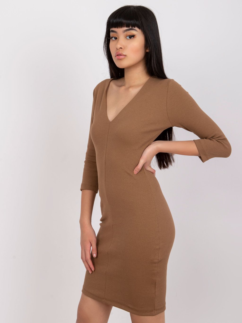 Tmavobéžové rebrované basic šaty Esra s výstrihom do V