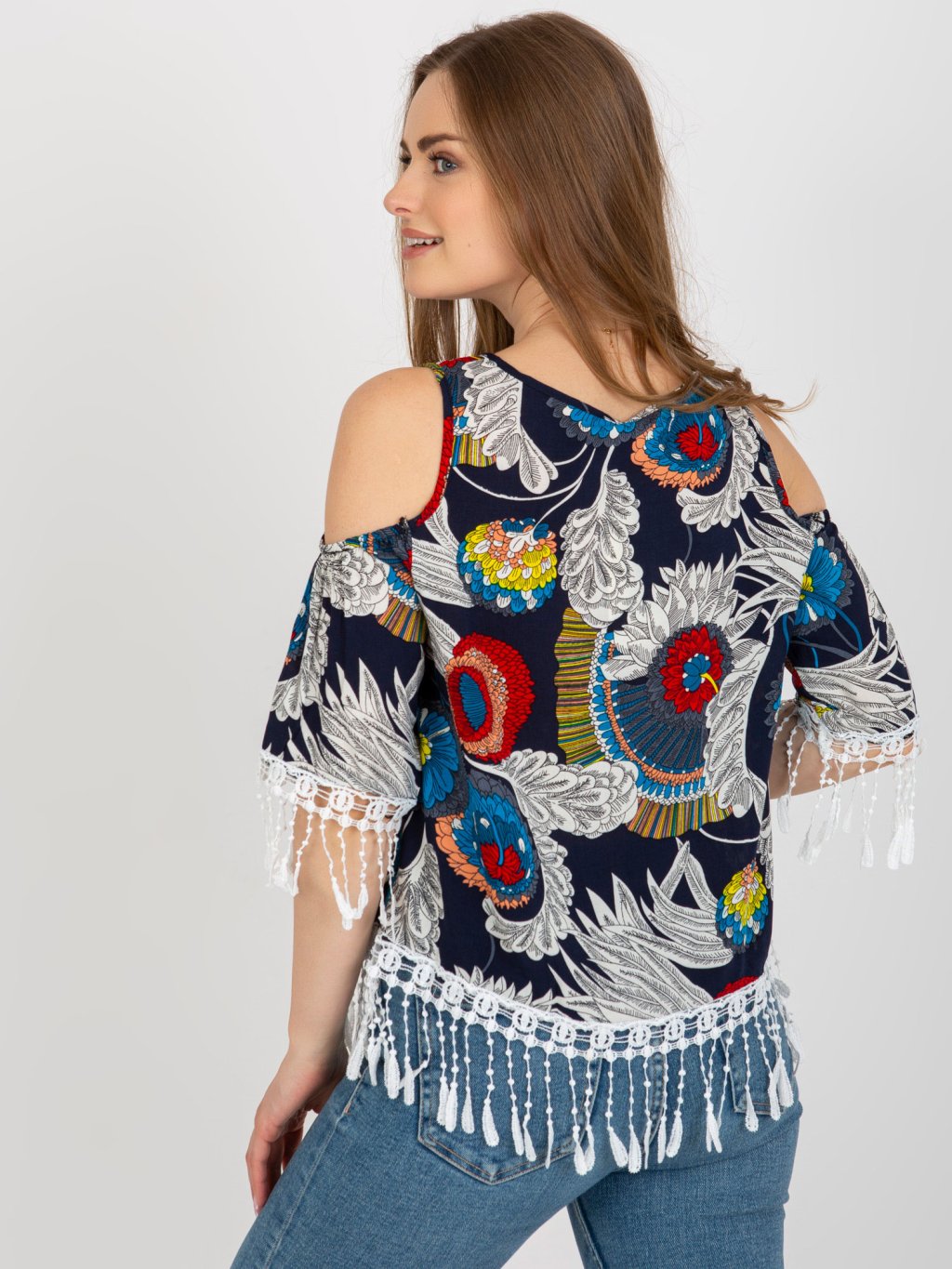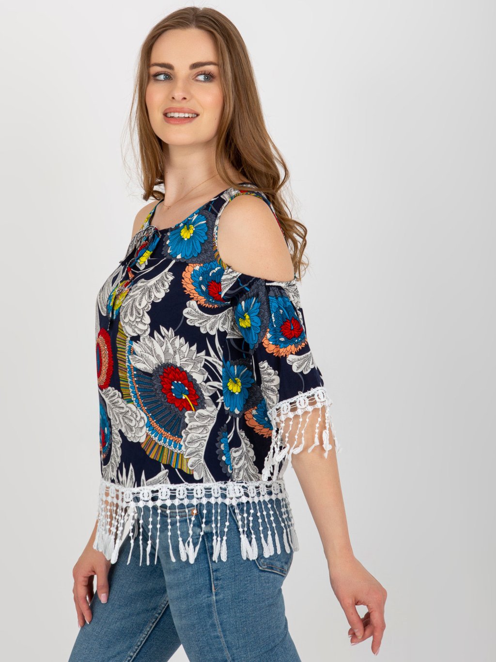 Tmavomodrý vzorovaný top so strapcami