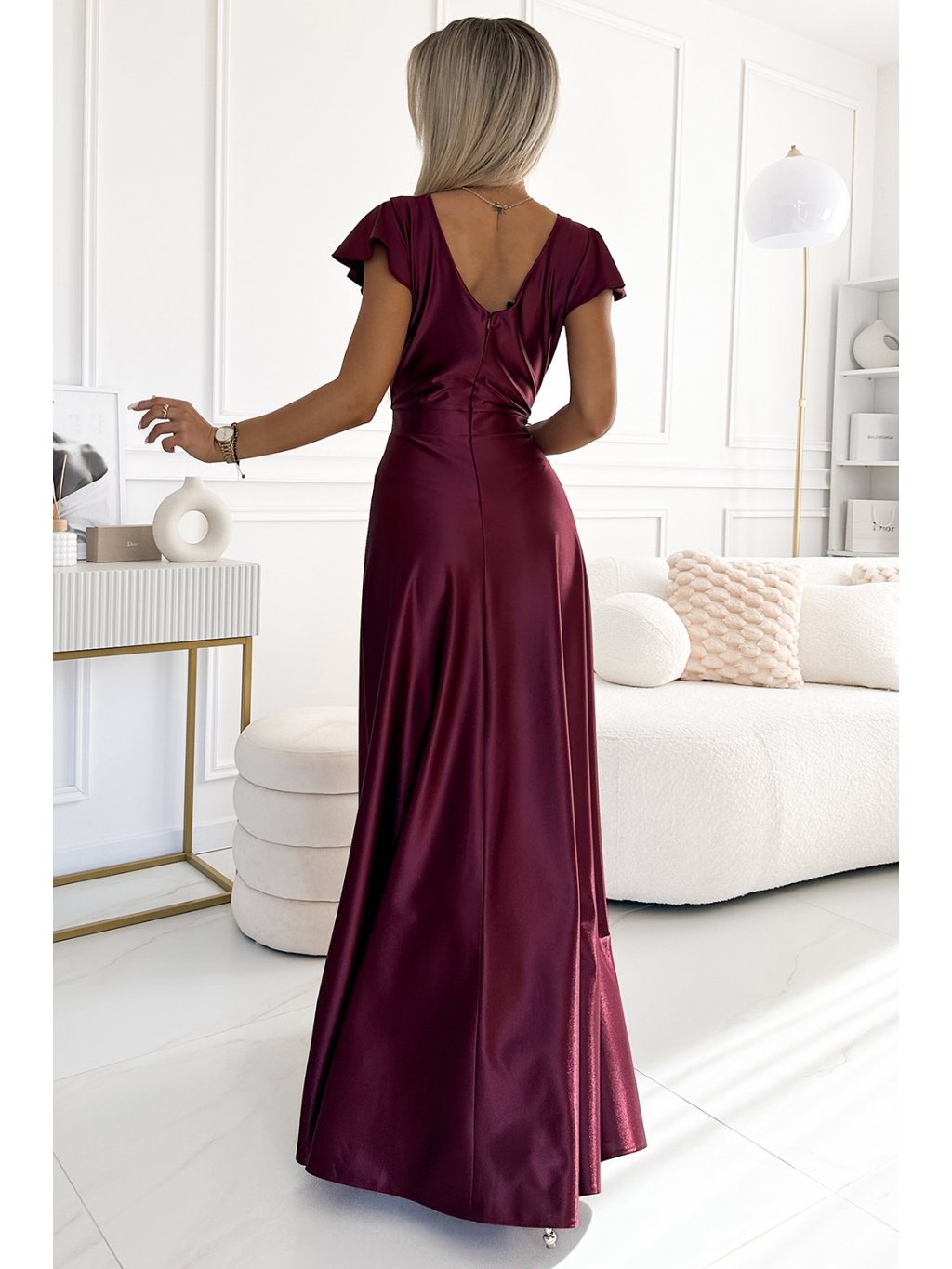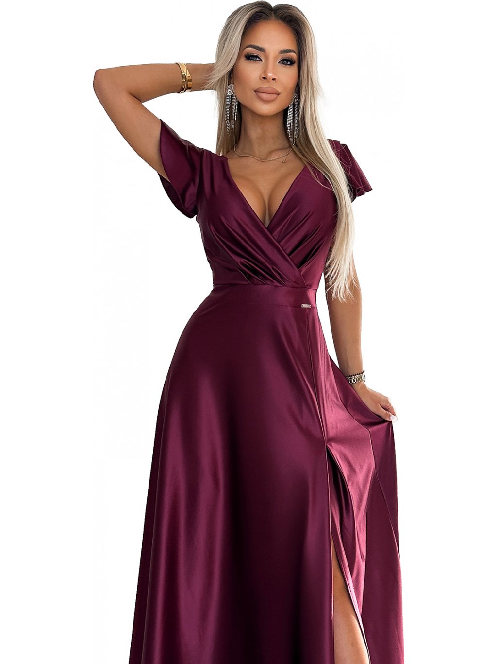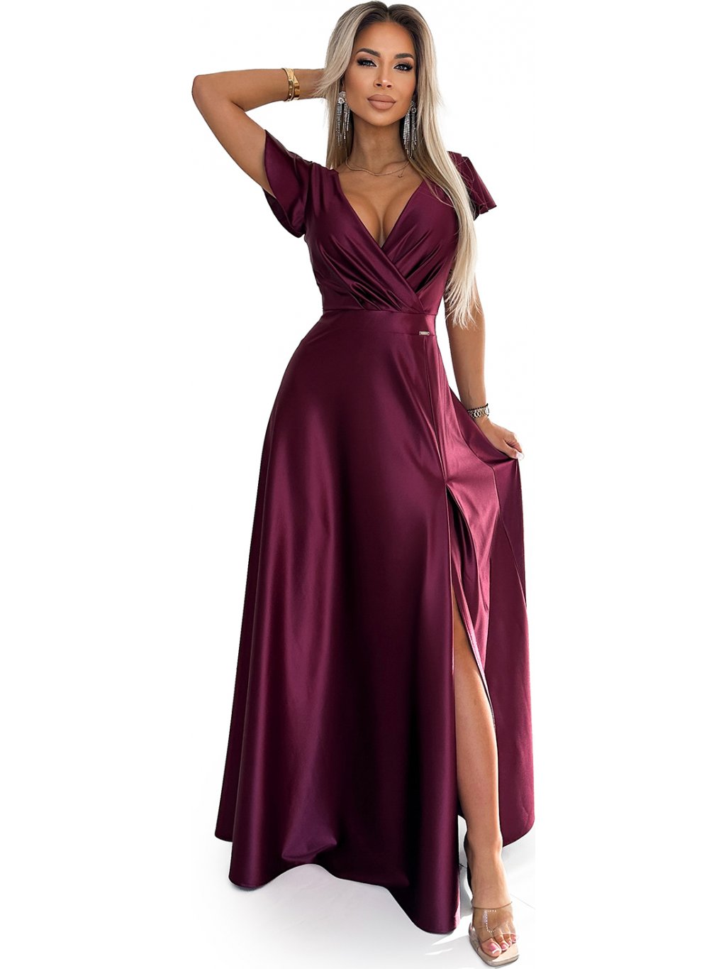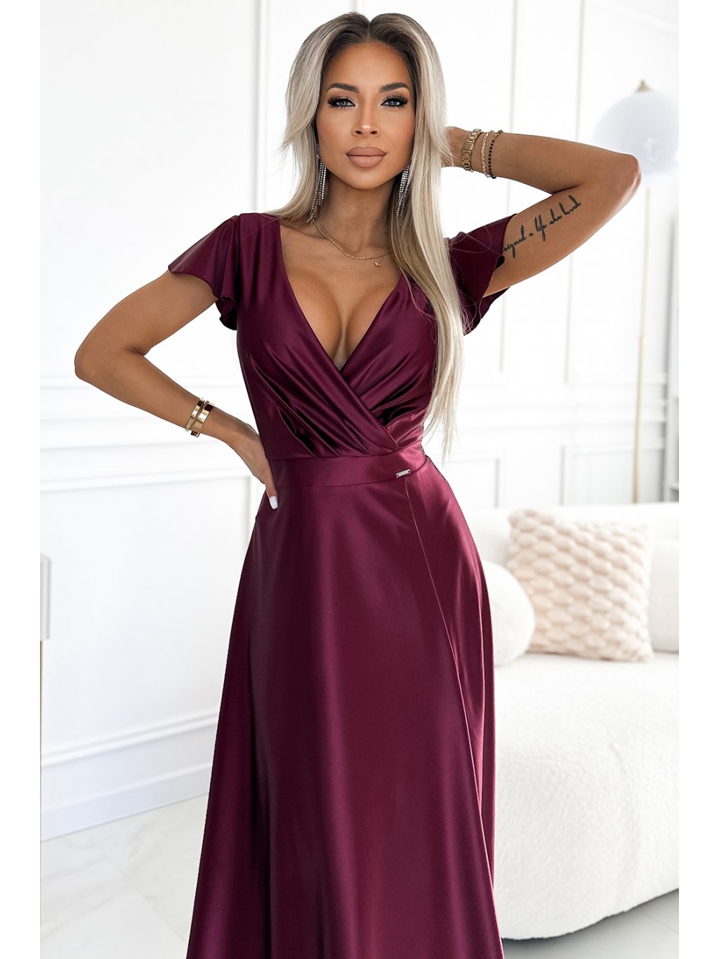 Vínové lesklé maxi šaty s výstrihom CRYSTAL