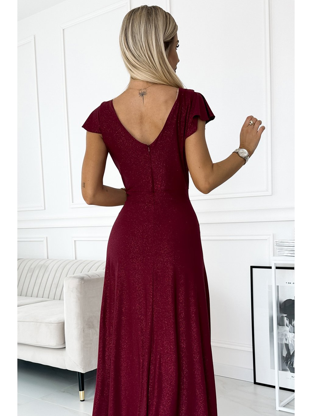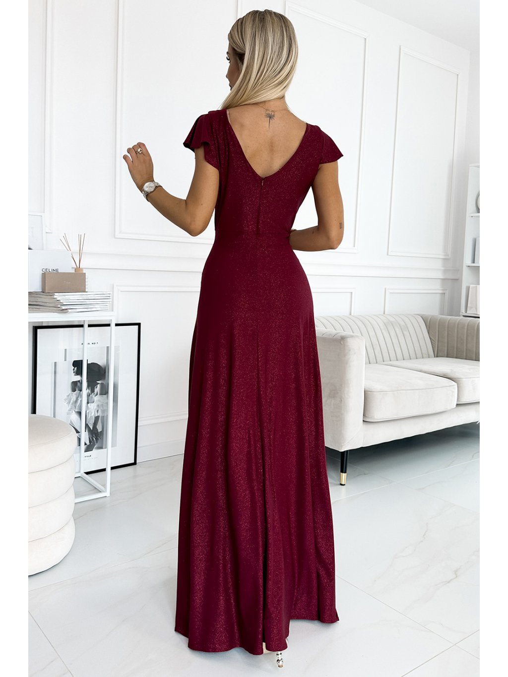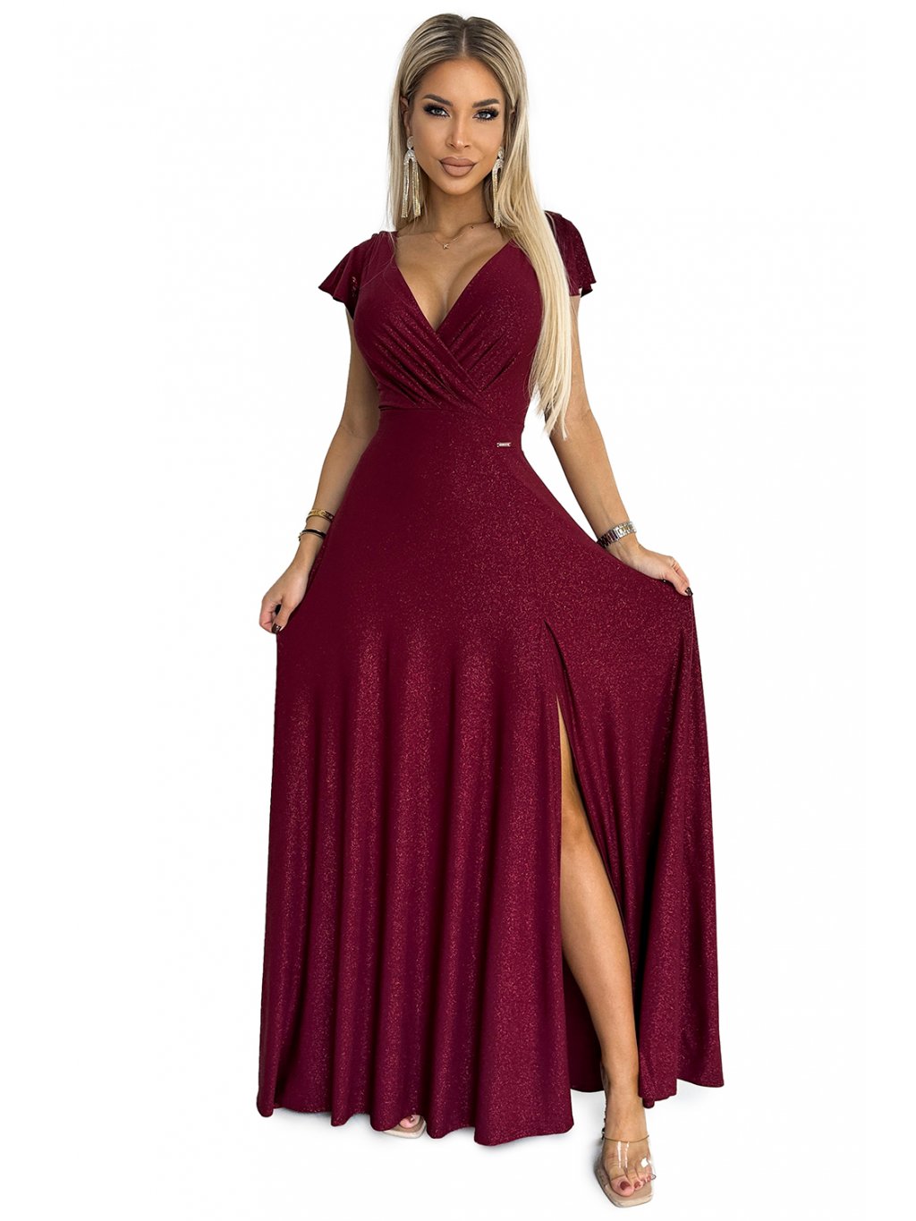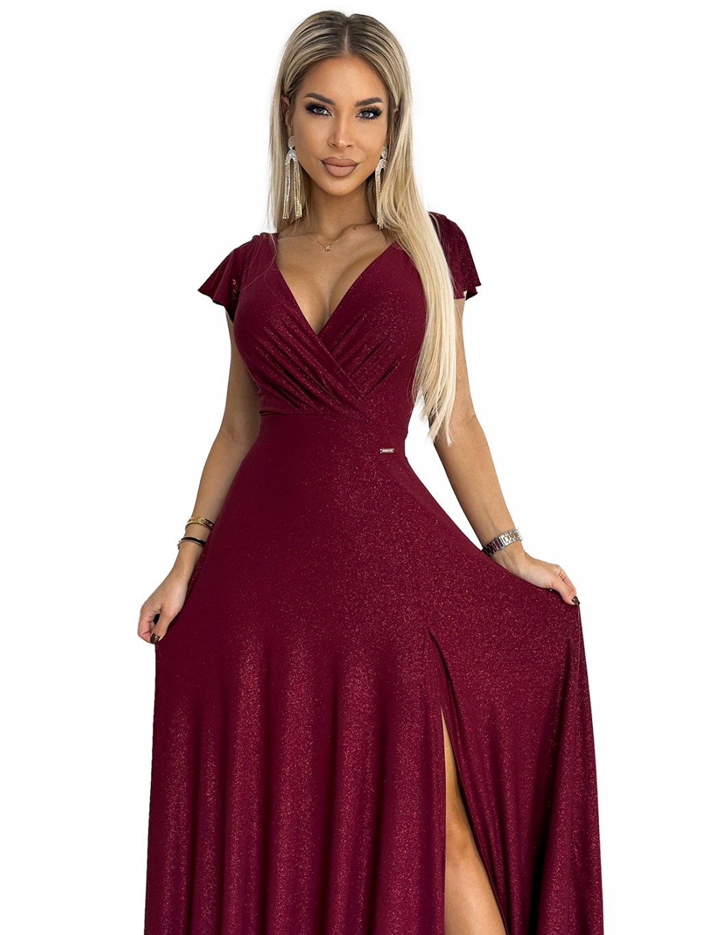 Vínové trblietavé maxi šaty s výstrihom CRYSTAL