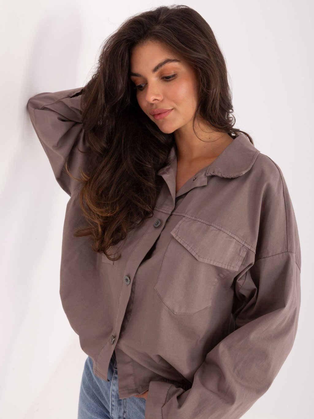Voľná tmavobéžová dámska košeľa s elastickým spodným lemom